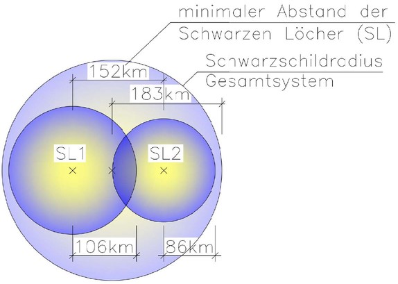 Damit kann man bei einer Umlauffrequenz von 1/250 Sekunden einen Abstand der beiden Schwarzen Löcher (SL) berechnen. Weiterhin kann man den Radius der einzelnen Ereignishorizonte der Schwarzen Löcher berechnen und den Radius des Ereignishorizonts nach der Verschmelzung der beiden Schwarzen Löcher ermitteln. Man erhält dann sehr merkwürdige Ergebnisse, welche ich in der nachfolgenden Grafik visualisiert habe: